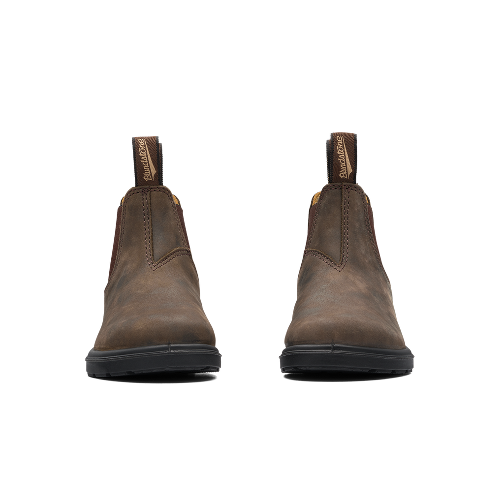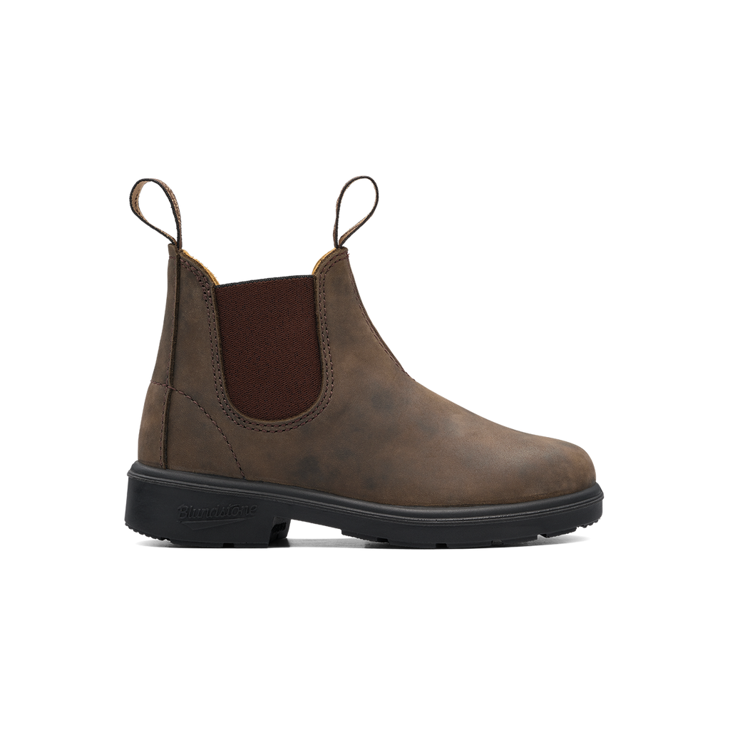 Blundstone 565 Kids Rustic Brown is Blundstone comfort and leather that ages beautifully. It's the DIY boot every kid loves. Look Ma, no laces! Removable footbeds for months more wear. Unisex sizing.