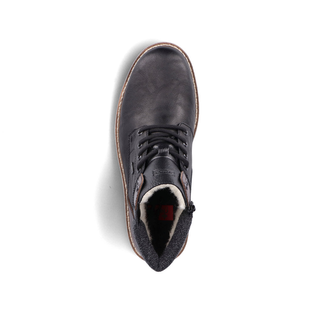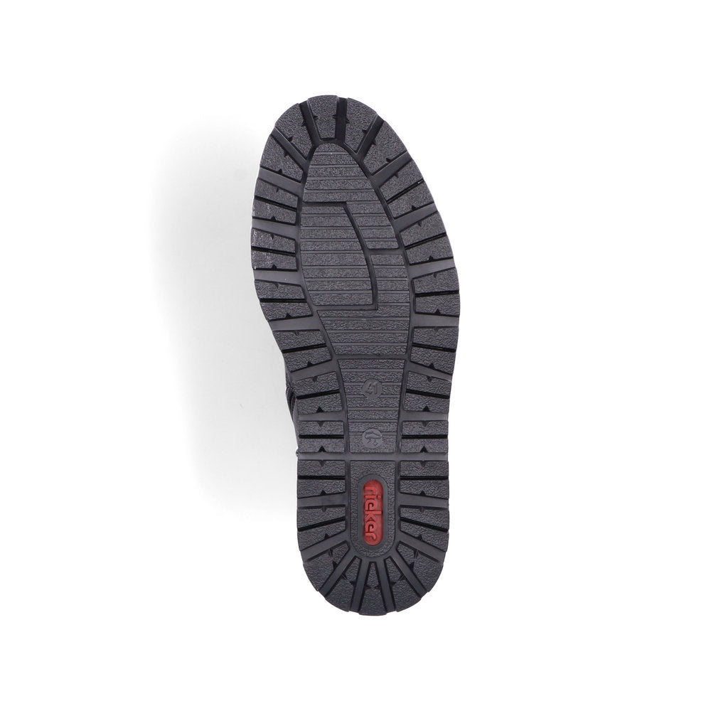 Experience unparalleled comfort with these black Rieker lace-up boots. Featuring both laces and a zipper, they are simple to put on and remove. Brown accents add a refined touch to their design. The durable sole ensures excellent traction and support, while the soft insole enhances comfort throughout the day. With a roomy fit, your feet remain comfortable during extended wear. The water-resistant RiekerTEX membrane combined with a warm virgin wool lining keeps your feet dry and cozy in all weather conditions. Ideal footwear for dependable warmth and style.