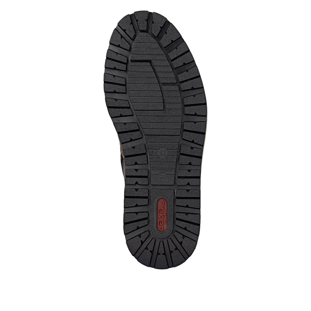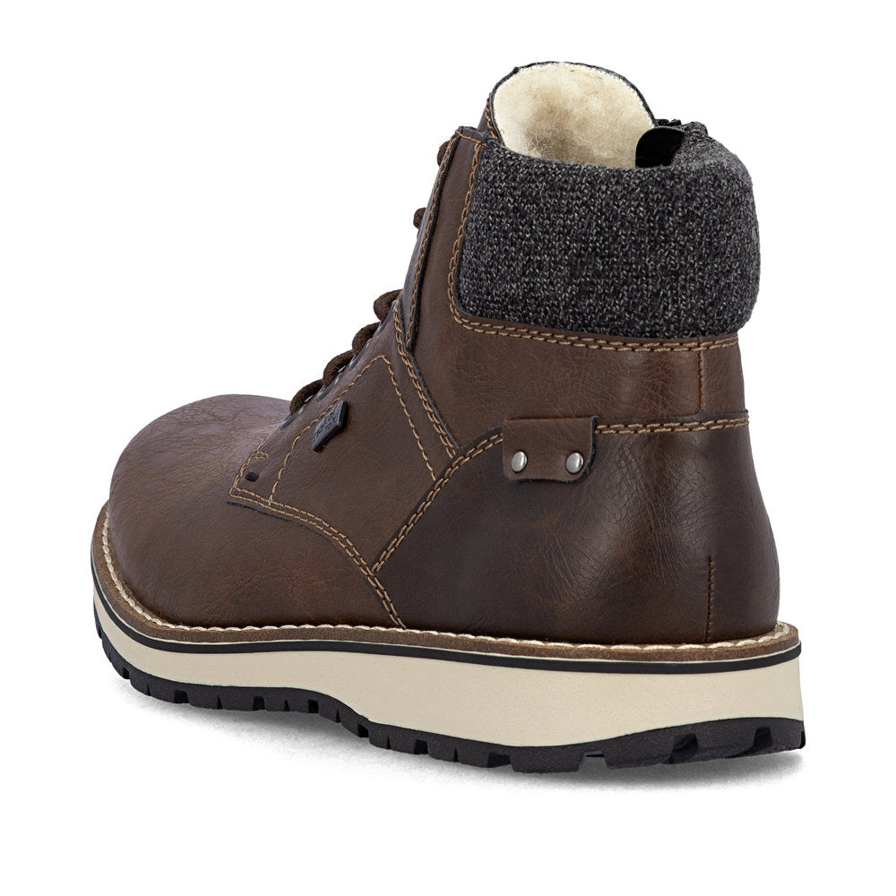 Experience unparalleled comfort with these brown Rieker lace-up boots. Featuring both laces and a zipper, they are simple to put on and remove. Brown accents add a refined touch to their design. The durable sole ensures excellent traction and support, while the soft insole enhances comfort throughout the day. With a roomy fit, your feet remain comfortable during extended wear. The water-resistant RiekerTEX membrane combined with a warm virgin wool lining keeps your feet dry and cozy in all weather conditions. Ideal footwear for dependable warmth and style.