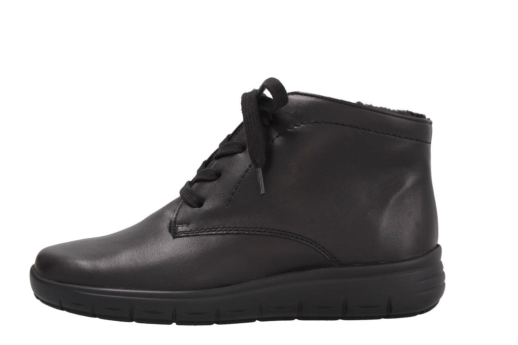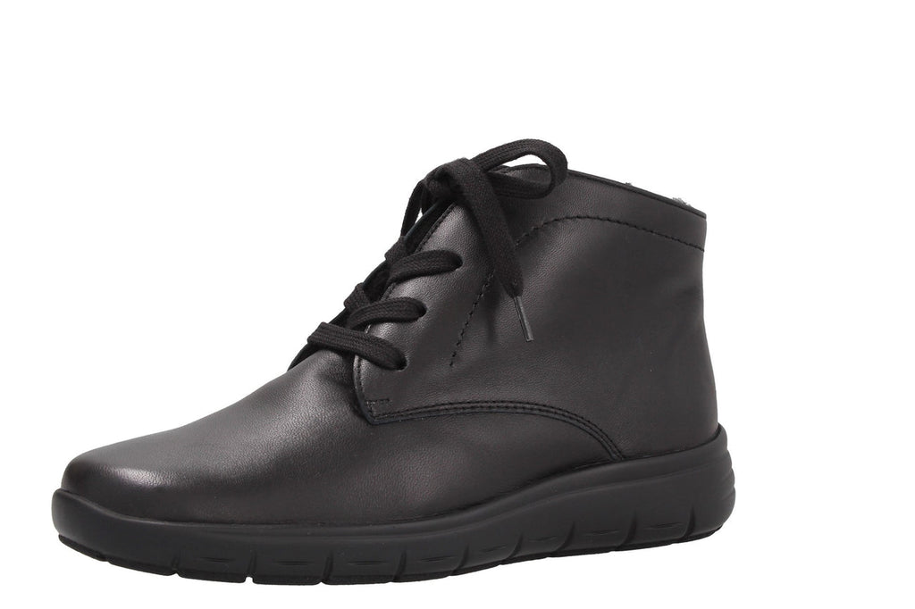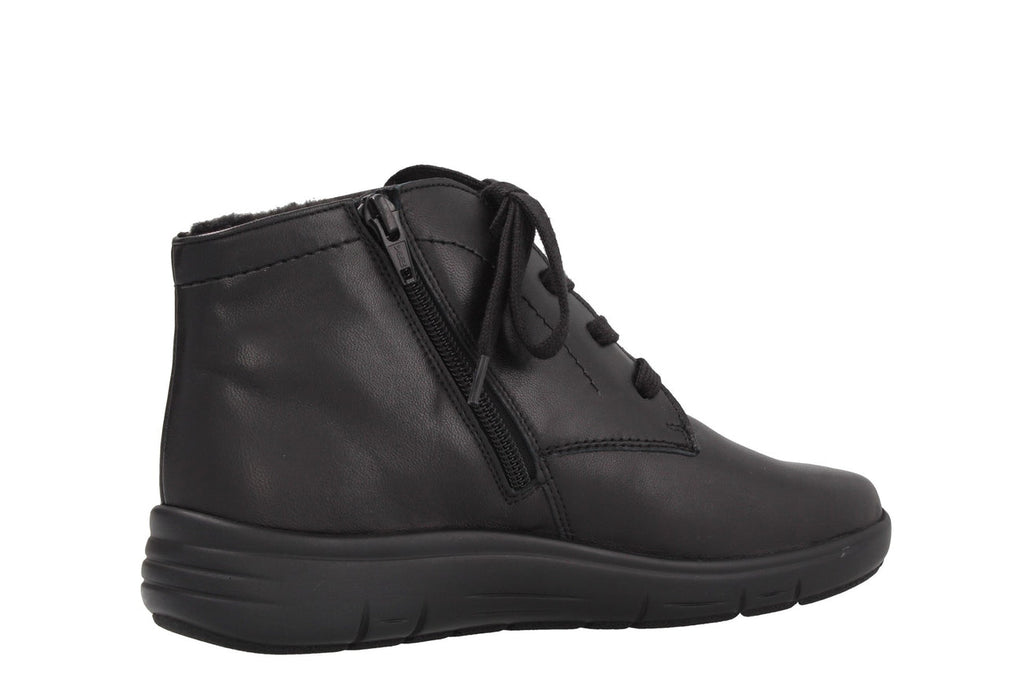 Step into comfort with the Semler Women's Gisela Boots—a sleek black lace-up ankle boot designed for the cooler months. The convenient side zip makes getting in and out effortless, while the soft Nappa leather wraps your foot in luxury. The H-width fit accommodates a roomier silhouette, and the Vario footbed adapts to your foot's natural contours for all-day support. Underfoot, the PU air cushion sole keeps you cushioned and grounded, with anti-slip technology that keeps you steady on any surface. Perfect for autumn and winter adventures, these boots blend practical features with understated style.